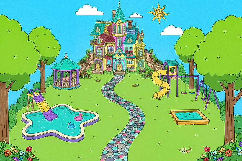 Spread across three floors, the property features spacious bedrooms, multiple bathrooms, and a variety of themed living spaces including a music and playroom, a fully equipped family kitchen, and bright children’s bedrooms. The expansive landscaped gardens boast a gazebo, a private pool with slides, and a dedicated play area – ideal for outdoor fun and entertaining.