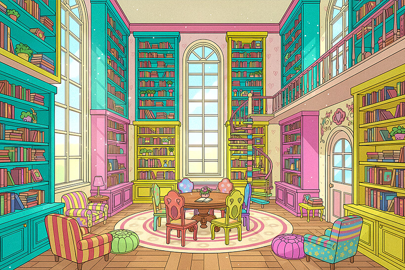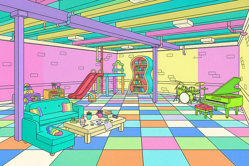 - Playroom with library nook, music instruments, and indoor slide