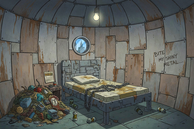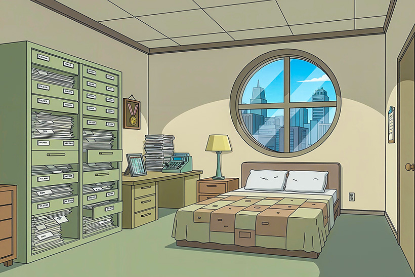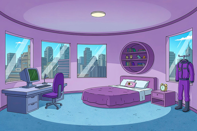 The upper-level suite embraces a true observatory aesthetic, featuring a circular glass enclosure that frames the skyline. The room blends comfort and curiosity, with built-in workstations, scientific detailing, and an open-plan layout that encourages inspiration at every turn.
