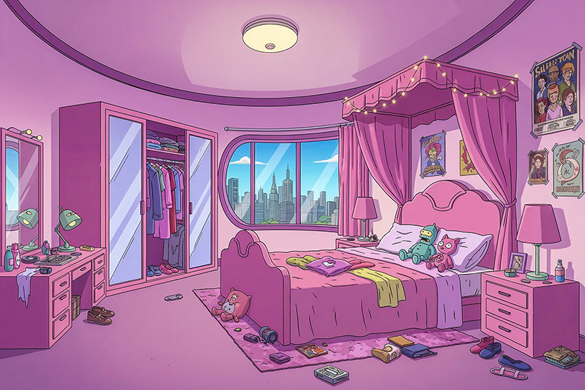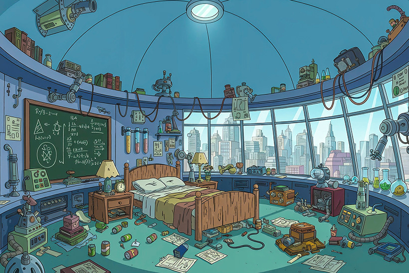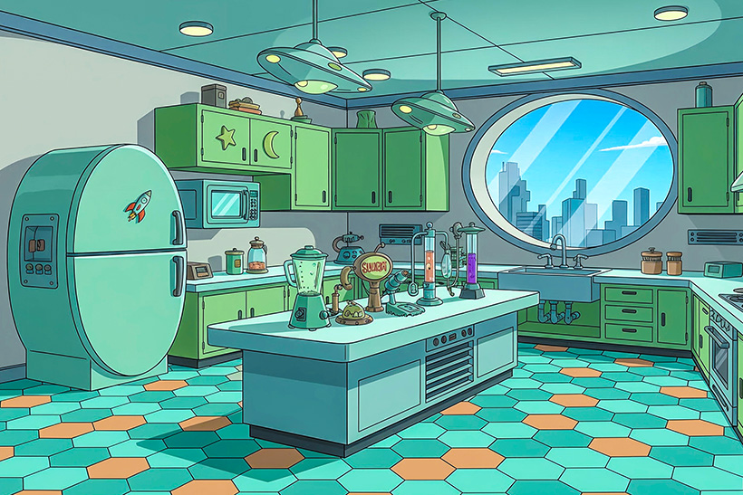 Inside, the kitchen and laboratory spaces combine functionality with playful futurism. Custom cabinetry in fresh mint tones, geometric tiled flooring, and statement lighting fixtures create a bright and imaginative environment. A central island doubles as both culinary workspace and experimental station, ideal for creative minds who thrive on innovation.