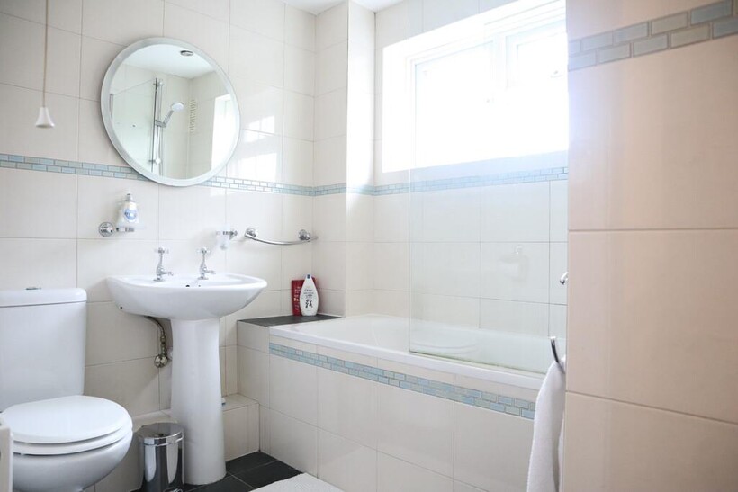 Bathroom: The modern bathroom features a shower over the bath, along with complimentary toiletries and towels for your comfort.
