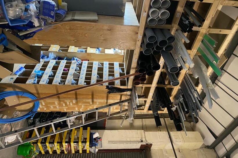 The store room comprises of: A metal shutter door, wall light point, stairs to the first floor, hard flooring and wooden shelving.