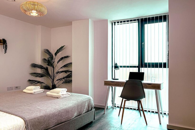 Located on the upper floors, you can access the apartment via a convenient lift or stairs.Embrace the urbanscape from the balcony through expansive windows, providing ample light and views of the skyline.Enjoy the added convenience of free parking, making it the ultimate five-star luxury stay!