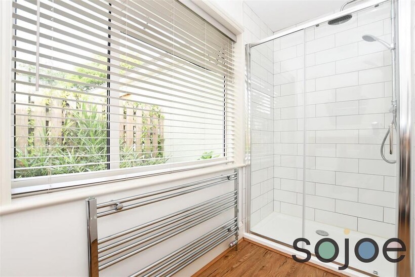 Shower Room - 3.34 x 1.23 (10'11" x 4'0") - Karndean flooring, double glazed window to the side aspect, heated towel rail, tile splash back, suite comprises of toilet, pedestal wash basin and a mains fed shower with hand held & rainfall attachments set into a cubicle enclosure.