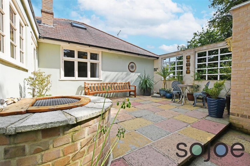 To the side the property, off road parking is provided and a pathway leads around to the rear garden with steps leading up. This garden showcases a paved area, complete with a table and chairs, a bench and a charming brick built feature well, all nestled amongst mature plants and trees. It's a serene and inviting space, perfect for relaxation.