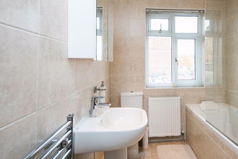 Bathroom Fitted with a white three piece suite comprising of tiled panelled bath with mixer taps and Aqualisa thermostatic shower unit over, glass panel shower screen, pedestal hand wash basin, low level w.C, chrome heated towel rails, double glazed window to rear, door to storage cupboard housing hot water cylinder with shelving over, down lights, tiled walls, tiled floor.