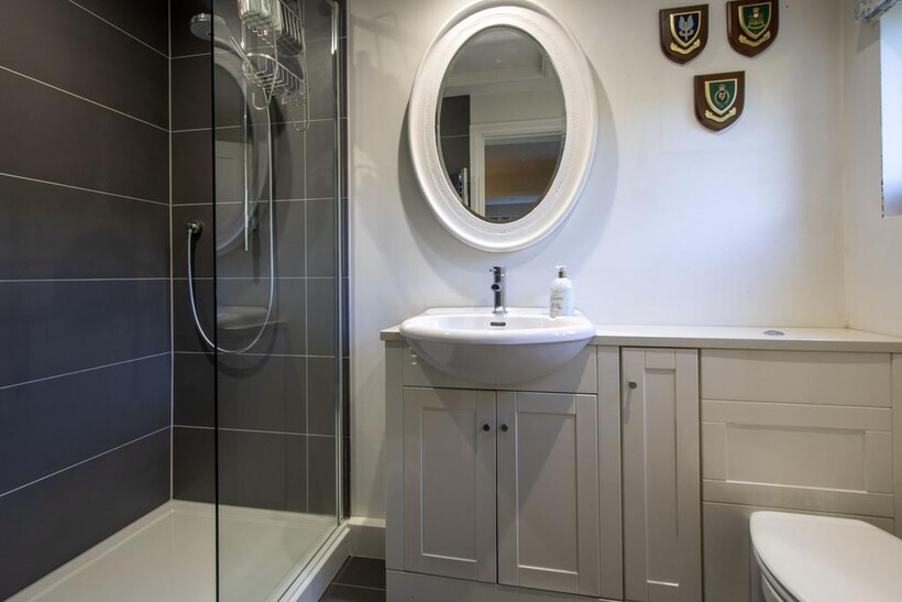 The upstairs boasts three good sized double bedrooms and an extremely stylish family bathroom with his'n'hers vanitory unit, white suite with bath and separate walk-in shower, heated towel rail.