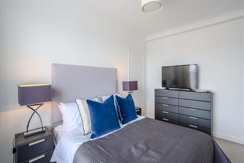 Both bedrooms are generously proportioned and feature double beds, bespoke wardrobes, and exquisite furnishings. The fully equipped kitchen, boasting under-cabinet LED lighting and top-of-the-line appliances.