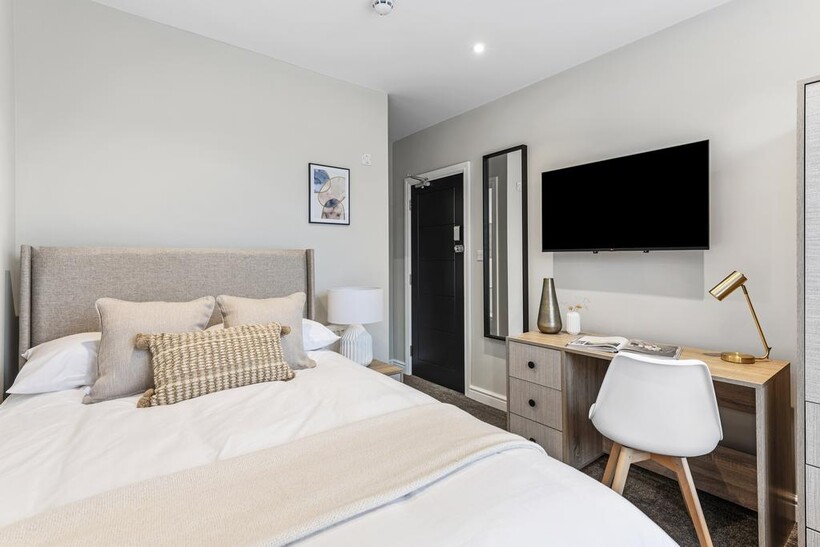 Indulge in the amenities of this room, including an ensuite bathroom, 43" Smart TV with Netflix subscription, a cozy double bed with premium linens and pillows, a spacious work desk, high-speed WIFI, and secure electronic key code access. The room is impeccably furnished to a high standard.