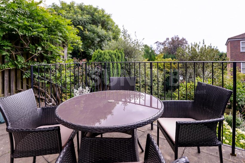 Off the entrance hall is a large open plan kitchen dining sitting room with sliding doors that lead out onto a terrace that has garden furniture and BBQ. Steps lead down into the rest of the garden.