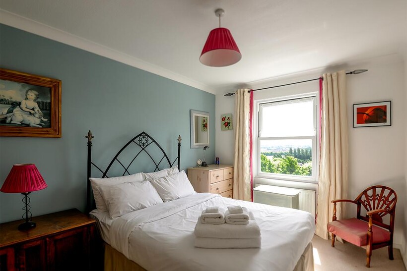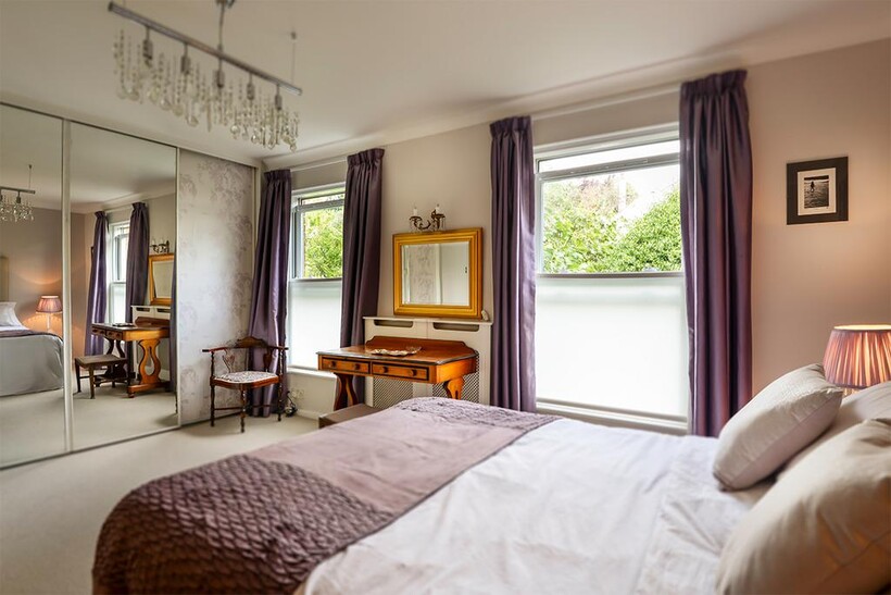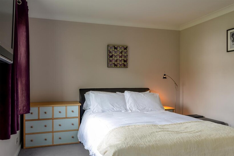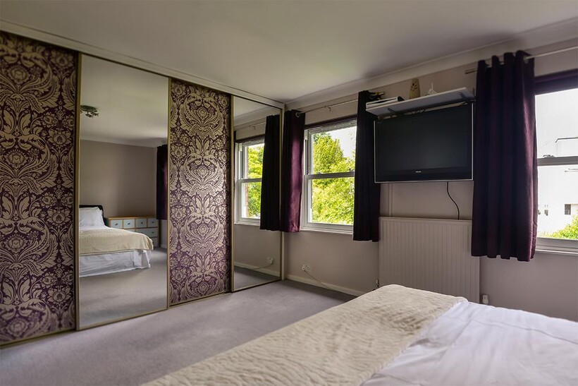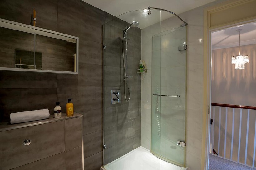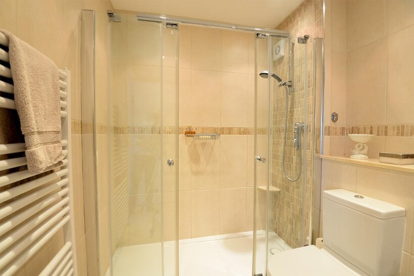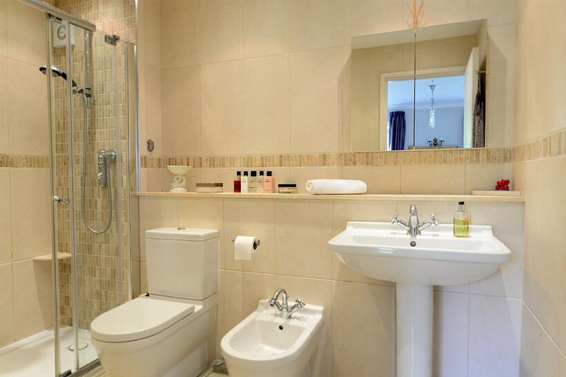 On the 2nd floor are two further bedrooms, one with a 5ft wide and a large TV on the wall and another bedroom with a standard sized double bed. These bedrooms share a bathroom with a shower cubicle, basin, bath and WC.