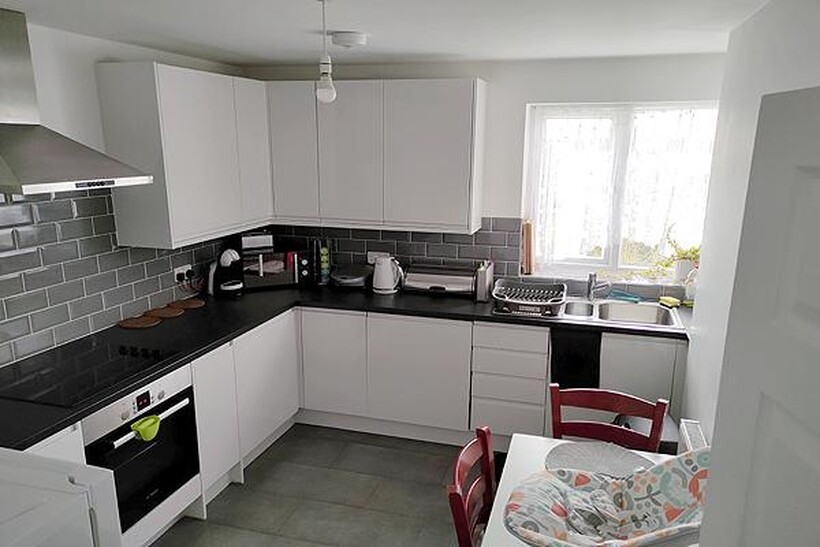 Tile flooring. White goods including integrated w/machine, fridge/freezer, electric oven & gas hob, fitted wall/base storage units, extractor fan, double-glazed window.