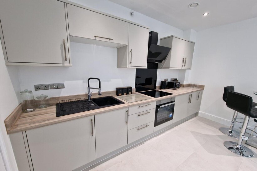 As you step foot into the apartment you are met with a modern and stylish high gloss coffee and cream kitchen, fully equipped with a hob, oven, fridge and washer/dryer.