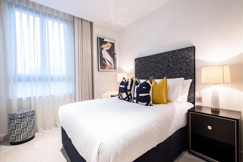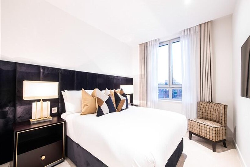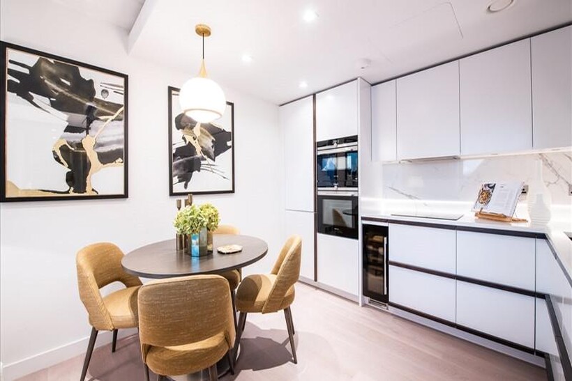 A luxurious, interior designed two-bedroom 4th floor apartment, set over 843 Sq.Ft., and comprising a large open-plan reception room which leads onto a private balcony, is now available. The fully integrated kitchen boasts appliances from Siemens and Miele, including oven and induction hobs, plus a large fridge freezer, dishwasher and wine chiller, which are all inset into composite stone work tops. The entire apartment also benefits from comfort cooling.