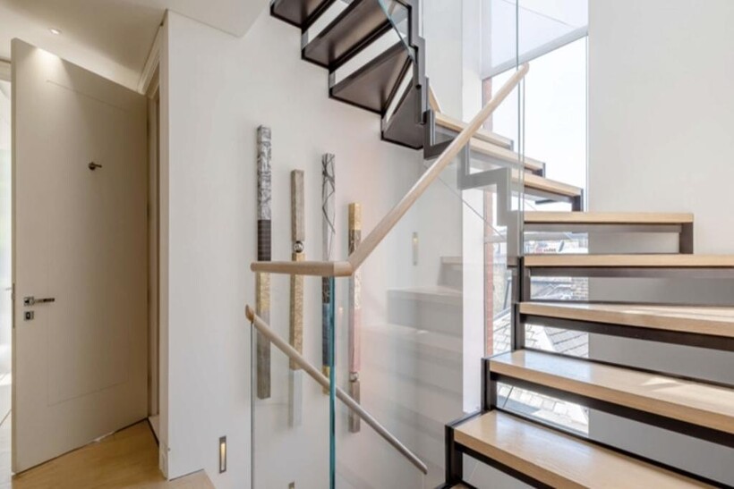 The contemporary style is spectacular: featuring glass panelling in the hallway and a modern open staircase with contemporary glass balustrade which allows for an abundance of natural light to enter the apartment.