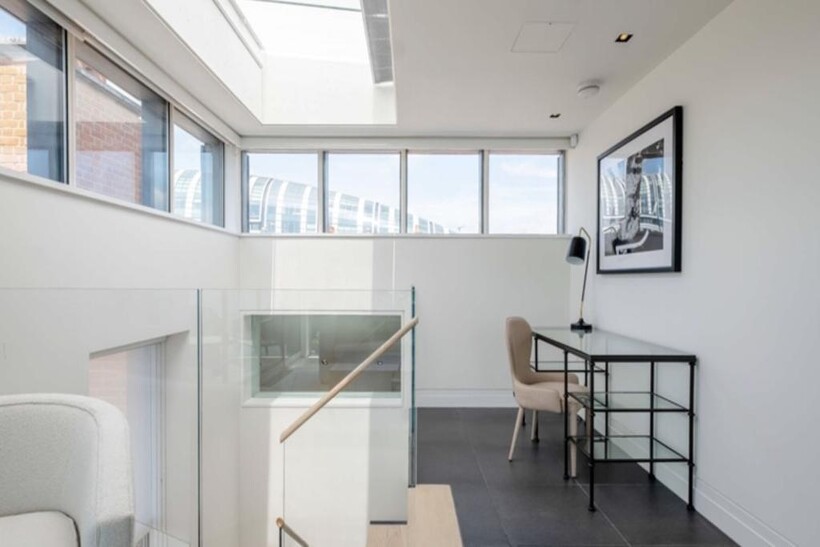This sky light mezzanine level can be used as an office or guest bedroom with an en-suite bathroom. There is access via Bi fold doors onto a private roof terrace with stunning views over central London.