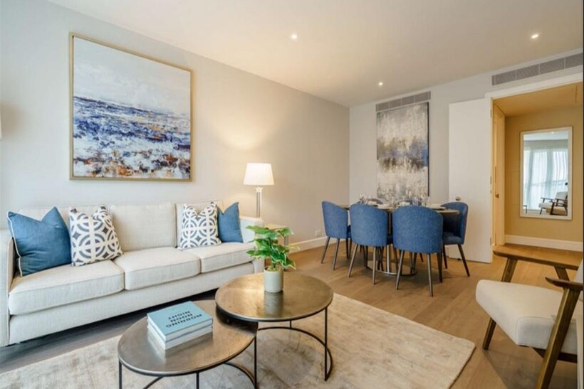 Two Bedrooms 2 Bathrooms Eight Floor Size: 965 Sq ftThis elegant two-bedroom, two bathroom apartment with a luxurious interior design is located on the eighth floor of a waterfront estate. Spanning over 966 SqFt, this spacious apartment features a modern open-plan living space that is fully furnished. The reception room boasts light oak wooden flooring and a dedicated dining area.