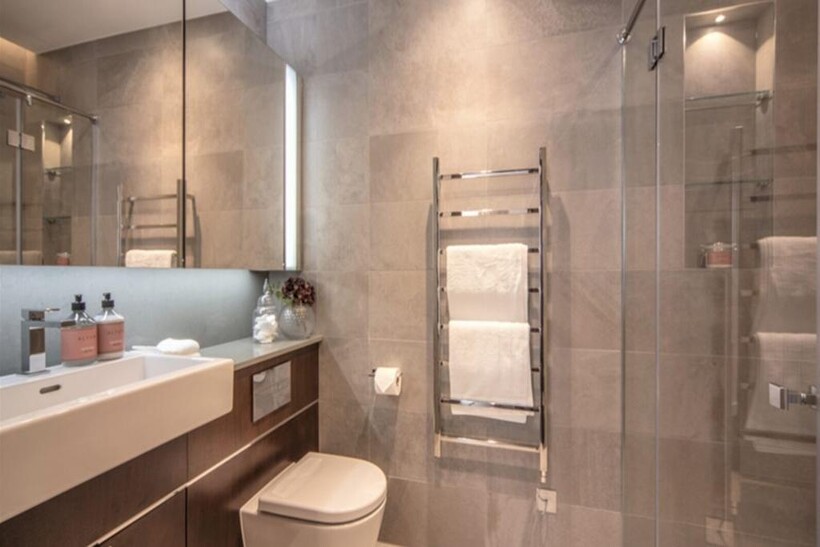 The apartment features a spacious reception area that includes Samsung Smart TVs with Bose sound bars. These TVs are equipped with a built-in Amazon Alexa, allowing you to effortlessly control the apartment's lighting, TV, and heating systems. The reception room seamlessly flows into a fully fitted kitchen with integrated AEG appliances and floor-to-ceiling windows, creating a bright and airy atmosphere.