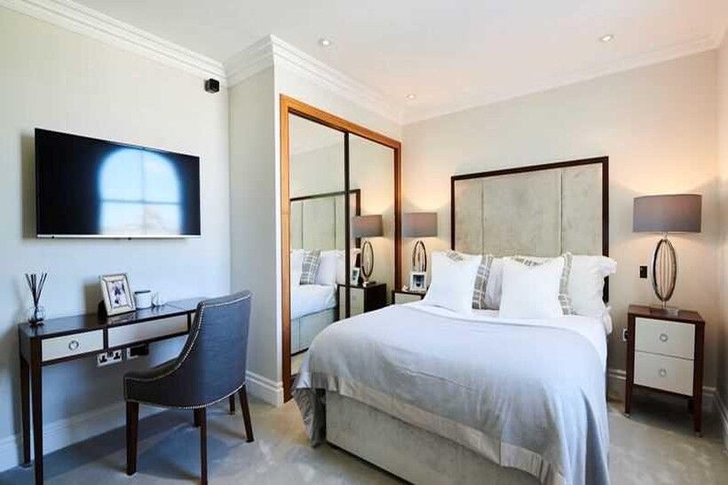 The apartment has been designed and finished to the highest of standards with high-end modern finishes whilst retaining its original Grade II listed features from the original building. The apartment comprises two splendid double bedrooms with storage, a luxurious reception with bespoke furniture, an exquisite polished marble bathroom, a further en-suite bathroom and a fully fitted bespoke Miele kitchen. Smart home technology with Smart TVs in the bedrooms and reception rooms.