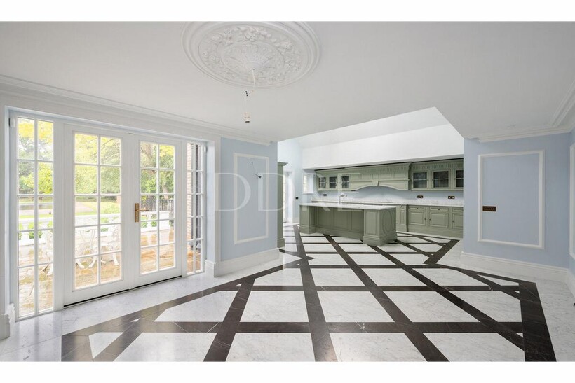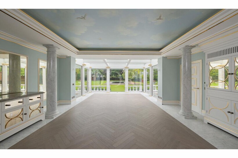 The kitchen is modern and classic, leading onto a magnificent dining room studded with marble clad columns and floor to ceiling windows opening directly onto the garden.
