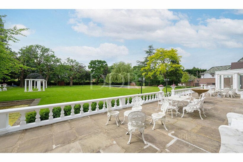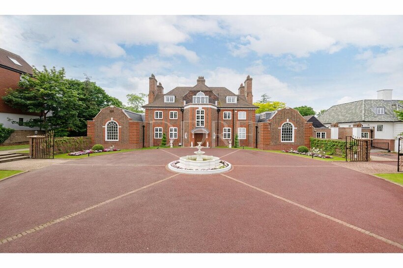 A traditional red brick mansion sits behind ornate security gates and a substantial oval drive. The house benefits from a spectacular landscaped garden with a large patio area overlooking the beautiful lawn, dotted with mature trees and pergolas. There is an outdoor swimming pool and an ornamental pond.
