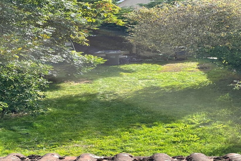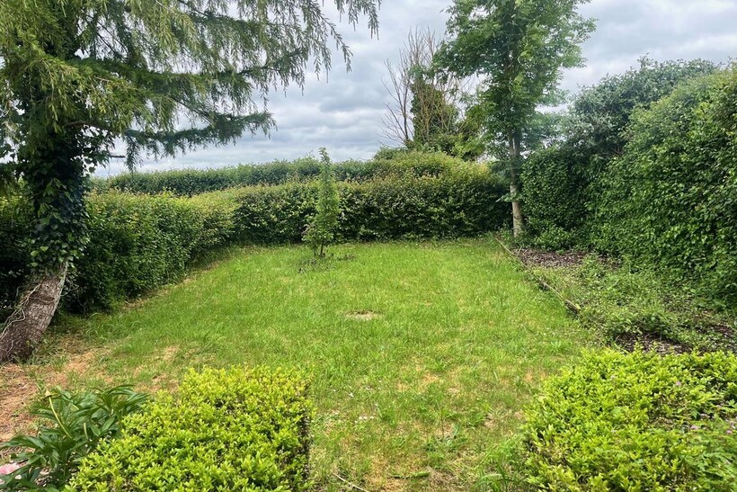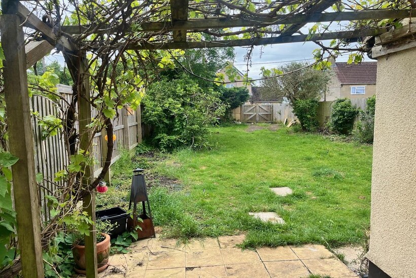 Large garden laid mainly to lawn with apple tree and vine which is growing over the pergola outside the French doors from the sitting room, provides grapes and shade! .