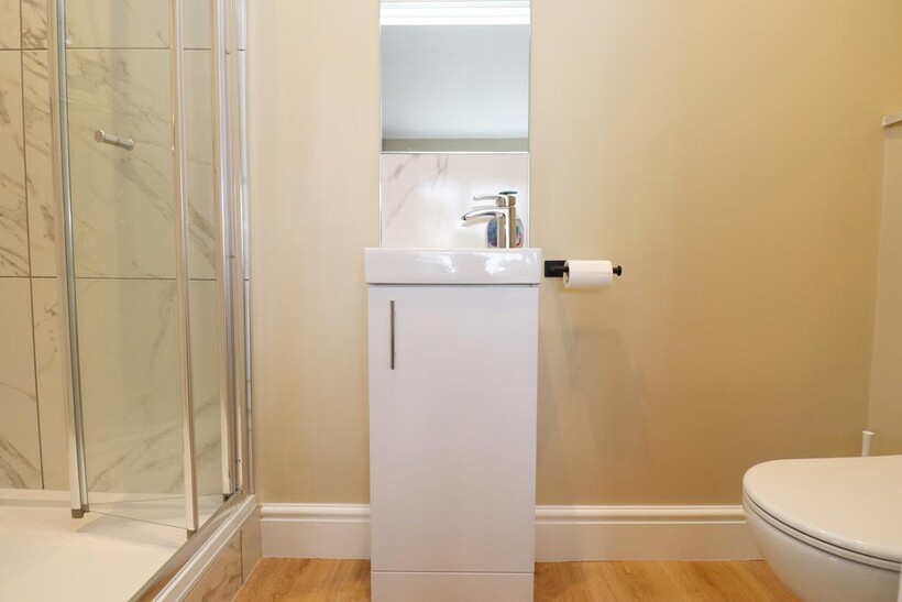 Up a small set of stairs from the landing, you'll find the first bedroom. This room is generously sized to accommodate a double bed and comes complete with a freestanding chest of drawers. Adjacent to this bedroom is a sleek and modern bathroom suite, featuring a button-flush toilet and a shower over the bath.