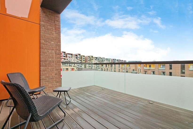 This stunning top-floor flat offers a spacious and modern living experience, featuring a generously sized living room with an open-plan, fully integrated kitchen, perfect for both entertaining and everyday living. The living area extends onto a large, private south-facing balcony, offering beautiful panoramic views, making it an ideal spot for relaxation.The flat includes two well-proportioned double bedrooms, both designed with comfort in mind, and a stylish family bathroom. Residents will appreciate the convenience of a secure entrance and a dedicated concierge service, enhancing both security and ease of living.