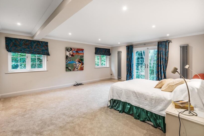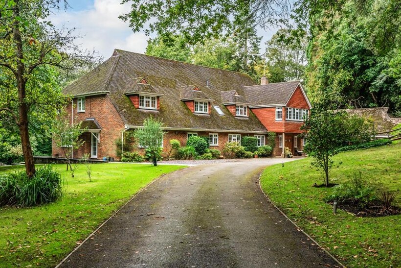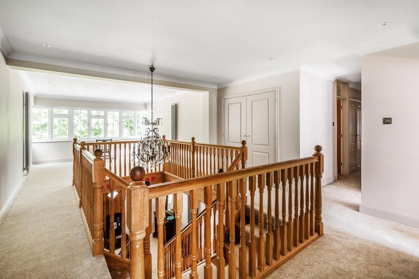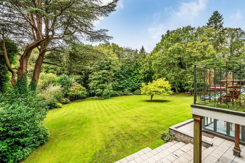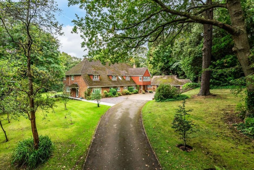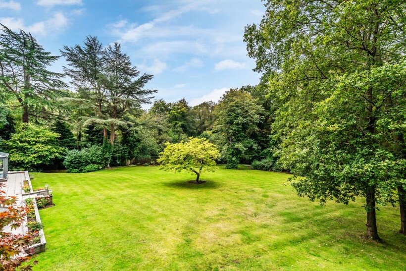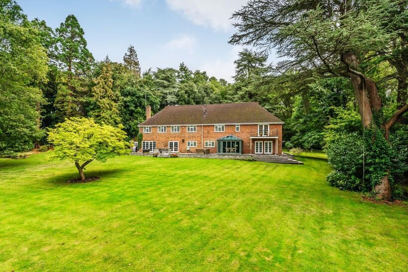 The property sits on approximately 3.3 acres, featuring beautifully landscaped gardens surrounding the house and a private woodland with scenic paths. A triple garage block includes a gym and wood store, adding further convenience. Electric gates at the entrance lead to a sweeping driveway, ensuring privacy and a sense of grandeur.