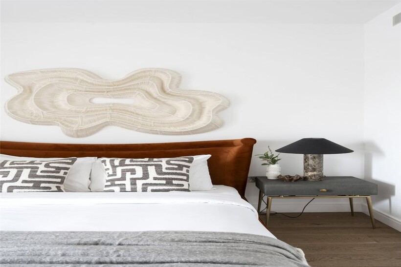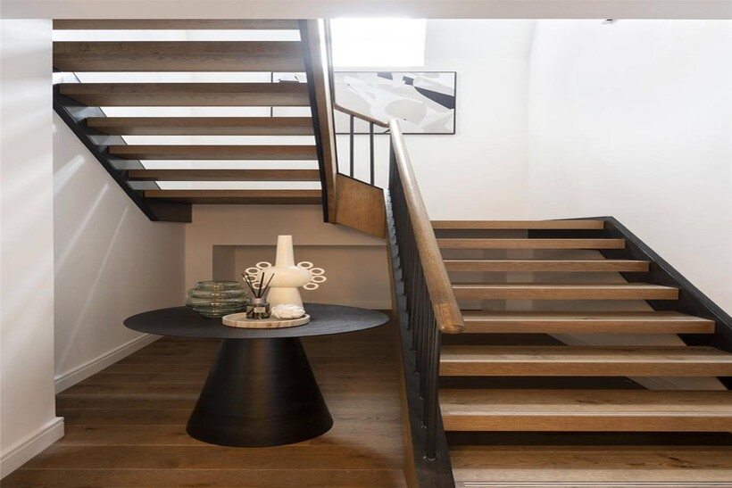 The heart of the home is a bespoke kitchen, a striking fusion of form and function. Dark veneered oak cabinetry and soft-closing drawers hide behind sleek, clean lines, while quartz countertops glisten below bronze mirrored splashbacks. Miele appliances, including ovens and an induction hob, ensure that every culinary endeavour is elevated. The island, with its induction hob and breakfast bar, invites intimate conversation over morning coffee or an evening aperitif. The adjoining dining area is equally considered; abstract monochrome artwork and a sleek table curate a perfect set up for hosting.