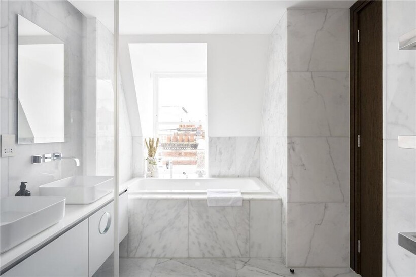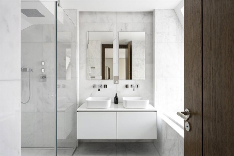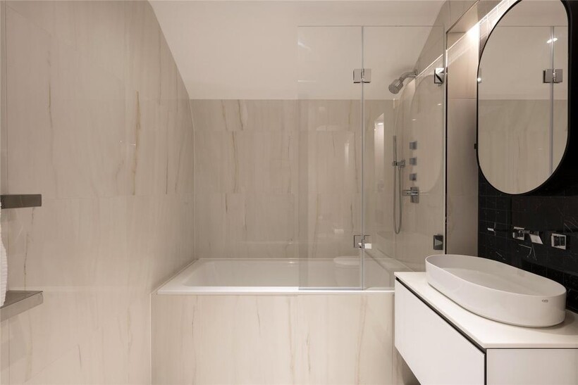 Elsewhere, the principal bedroom is a sanctuary of calm. Think neutral tones, considered details and bespoke wardrobes. In the en suite, heated tiles warm underfoot, while a deep bathtub and rainfall shower offer relaxation.