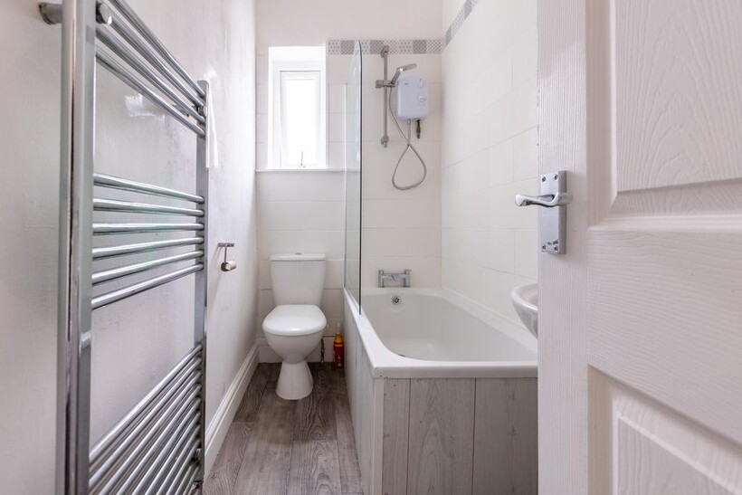First Floor: Ascending the staircase, you arrive at a landing adorned with double glazed windows to the rear, adding brightness throughout the space. This level hosts three bedrooms—two doubles and one single. Two of the bedrooms boast fitted wardrobes, providing ample storage solutions, and high ceilings that enhance the sense of space across the property. The newly installed bathroom serves the bedrooms with a threepiece white suite that includes a bath with newly installed power shower over, a low flush WC, and a pedestal wash basin. Parttiled walls and a ladder radiator add functional elegance to this well-appointed bathroom.
