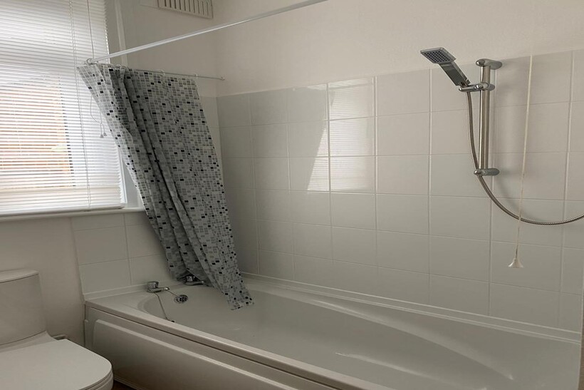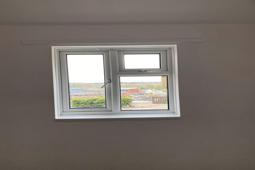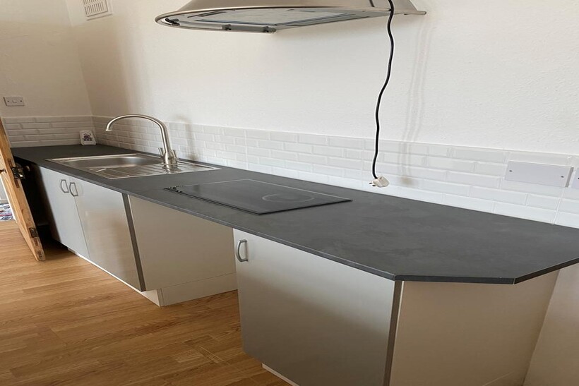 Modern fitted, contemporary kitchen with electric oven, hob and extractor fan. Space for fridge freezer and washing machine.