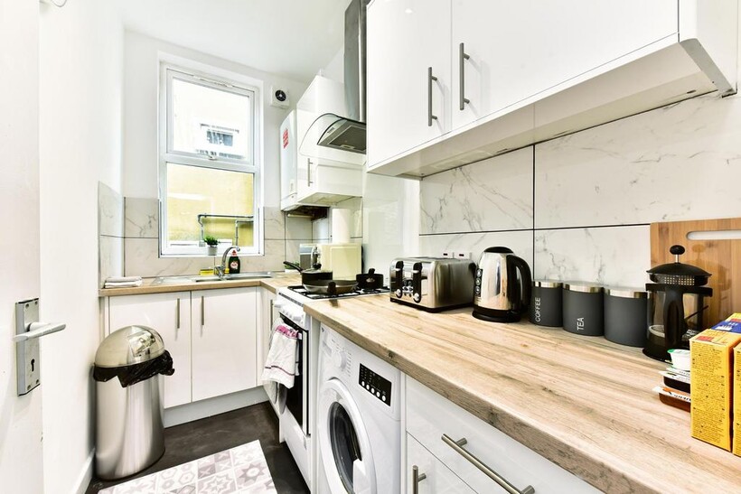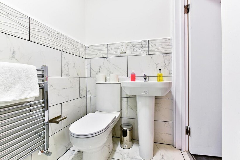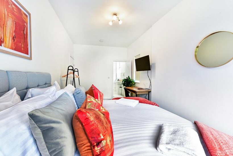 West Ealing Serviced Apartment B is a two bedroom, two bathroom superior apartment with free allocated off-street parking. The living room has comfortable seating including 2 sofa beds, plus a dining area with table and chairs. We provide a Smart TV with a very fast internet connection (and wifi) so you can log into your Netflix or other services.