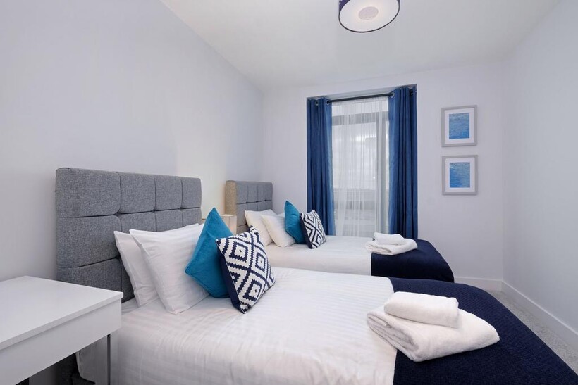 For sleeping, the main bedroom has a superking-size bed plus wardrobes and bedside tables etc. The second bedroom has two single beds, a clothes rail and bedside tables etc. The family bathroom comprises shower over bath with sink and toilet and an en-suite to the master bedroom. The apartment also has wall to wall floor to ceiling windows providing plenty of natural light with the lounge opening onto the balcony.