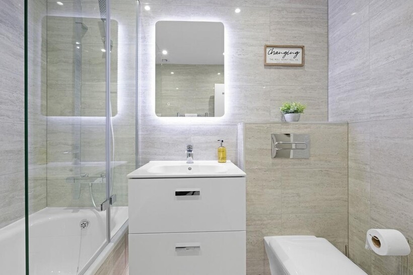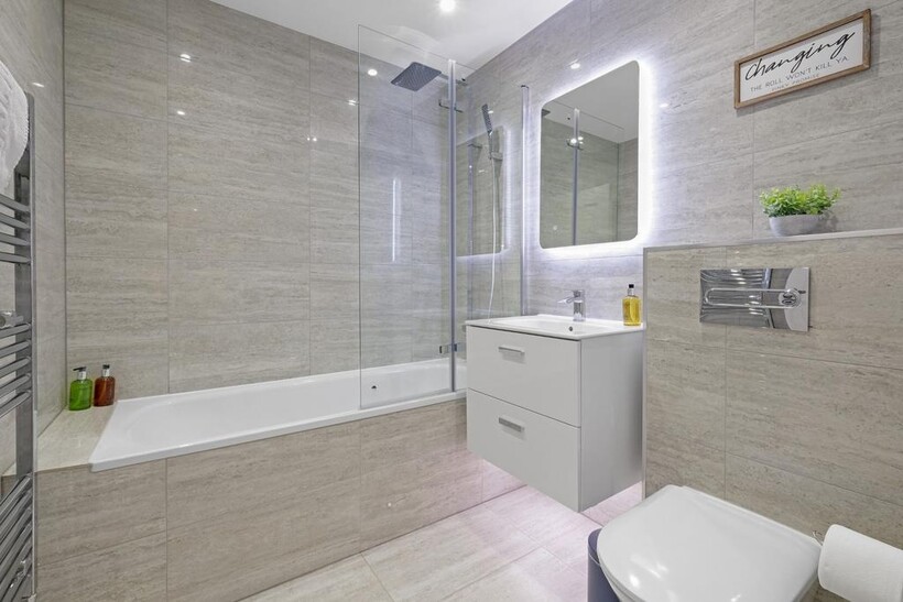 Crown Place 3 Bedroom Luxury Apartment 04 in Shepperton is a three bedroom, two bathroom superior apartment with parking and and WiFi.The living room has comfortable seating including a 3 seat sofa and a sofa bed, plus a dining area with table and chairs. We provide a Smart TV with internet connection so you can log into your Netflix or other services.
