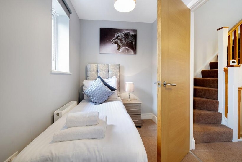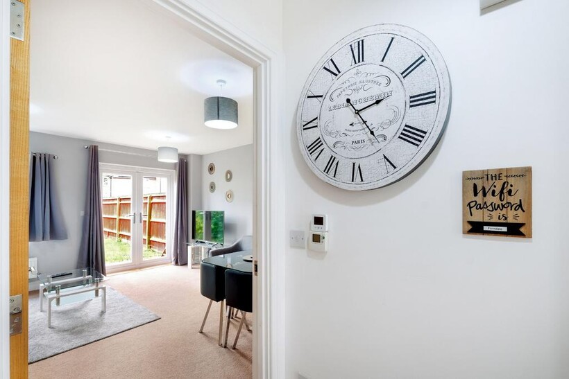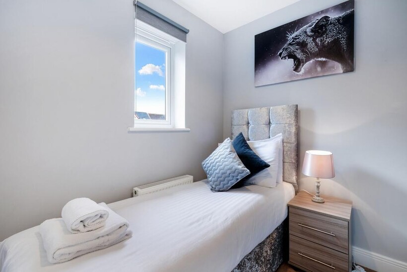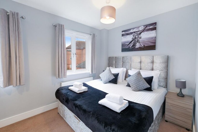 360Stays' Modern 5 Bedroom 3 Bathroom Serviced House is a newly built bright, modern, spacious house perfectly situated in Aylesbury, close to the town centre. Has 4 double bedrooms. The kitchen is well equipped, and the living/dining room has seating and tables plus Smart TV, Amazon Alexa, and free Wi-Fi. Set over 3 floor this house offers plenty of living space. Parking on the drive for 2 cars. Also located conveniently just off the A41 providing easy access to the town centre, M25 and the M1 and the surrounding areas. The mixture of single and double beds provides a wide range of sleeping options. The fully equipped kitchen/dining room has a sociable 'heart of the house' feel to it, while the living room has Smart TV, Amazon Alexa, and fast and free Wi-Fi, which is of course available throughout the house. The kitchen is equipped to a high standard, so if you are just sorting out breakfast or if you fancy cooking dinner yourself... it includes the basics like electric kettle, toaster, microwave, fridge, plus a decent hob, electric fan oven, and it comes fully equipped with kitchenware, utensils, pots and pans, cutlery, crockery and glasses as you expect.