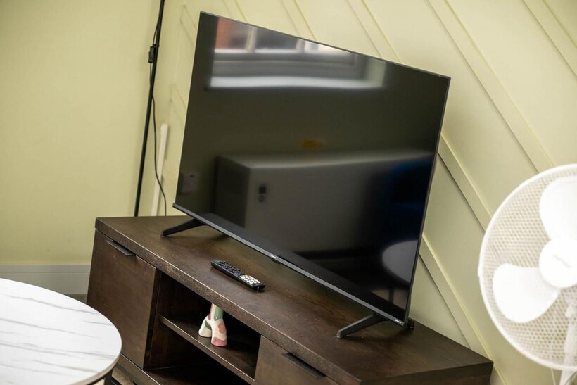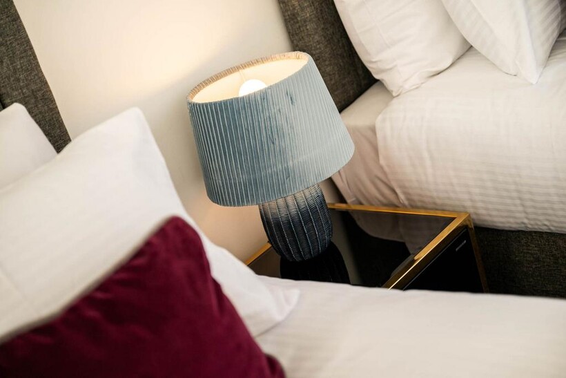 The tranquil bedroom offers a peaceful retreat, complete with three comfortable single beds with soft linens; complete with hanging space.