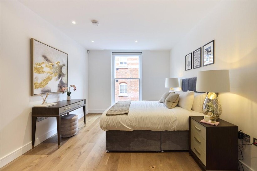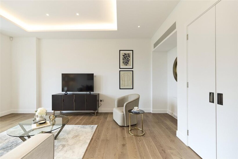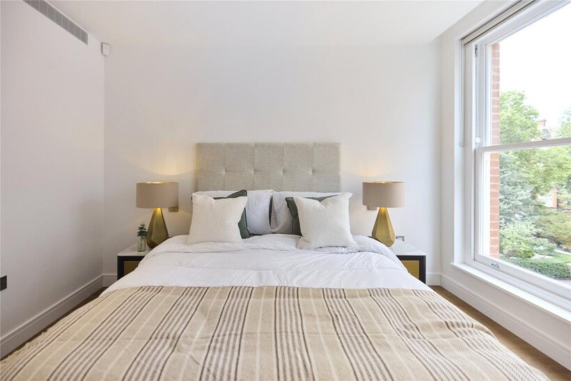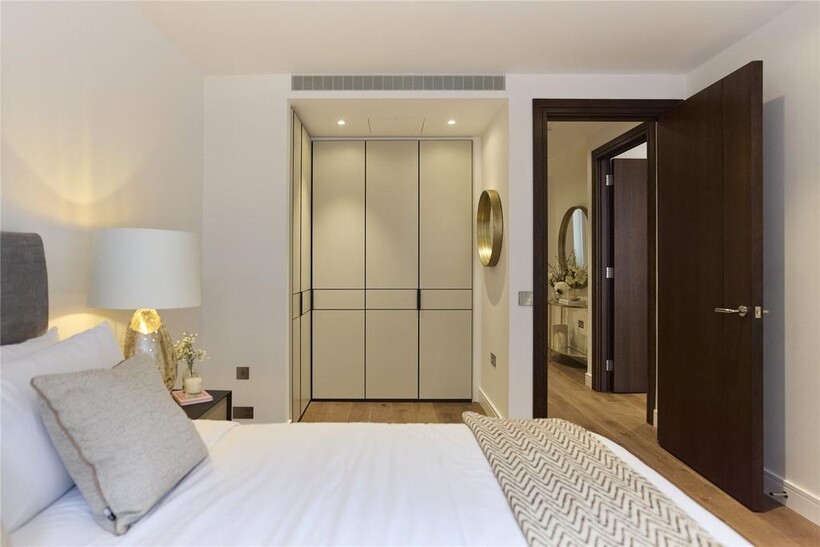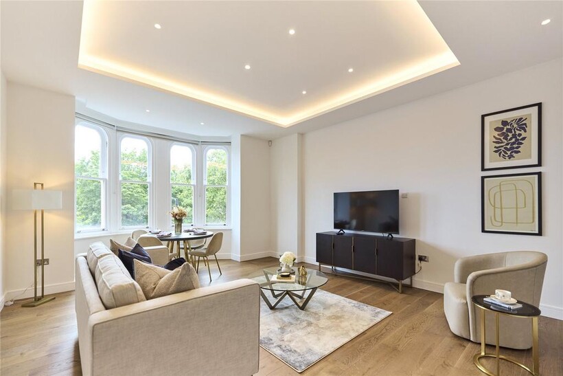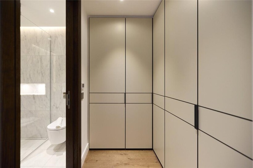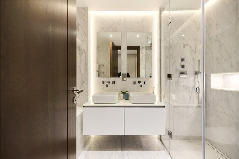 Beyond a polished lobby with a discreet concierge, the smart interiors of this considered apartment are a mirror of its location. Engineered oak floors run throughout the open-plan living space, where a grand bay window acts as the room’s focal point, overlooking leafy Hyde Park blow. A sleek circular dining table occupies the space in front of the window, while a large sofa occupies the other side of the room. Thoughtfully designed lighting – dimmable spotlights and overhead LEDs – allow for the perfect ambiance at any time of day.The kitchen fuses form and function. Soft-closing drawers, clean lined cabinetry and quartz countertops are illuminated by a mirrored splashback. Miele appliances, including an integrated oven and an induction hob, are in keeping with the practical, elevated feel.