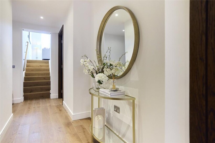 The principal suite is a sanctuary of calm. Think neutral tones, considered details and a bespoke walk-in wardrobe leading to the en suite bathroom. Marble tiling lines the walls, while a deep bathtub and walk-in shower offer relaxation. The guest bedroom features ample build-in storage and a palette that soothes. The room is served by a family bathroom with a sizeable bathtub and rainfall shower.