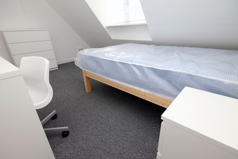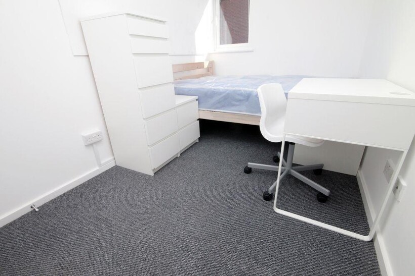 The open plan lounge/kitchen offers a great entertaining space with white walls and dark grey, wooden laminate flooring making the property feel bright and clean. The white gloss units in the kitchen go with the modern decor. Large patio doors open out from the living room in to the low maintenance garden letting in a fabulous amount of light. The house offers five double bedrooms for students to choose from.