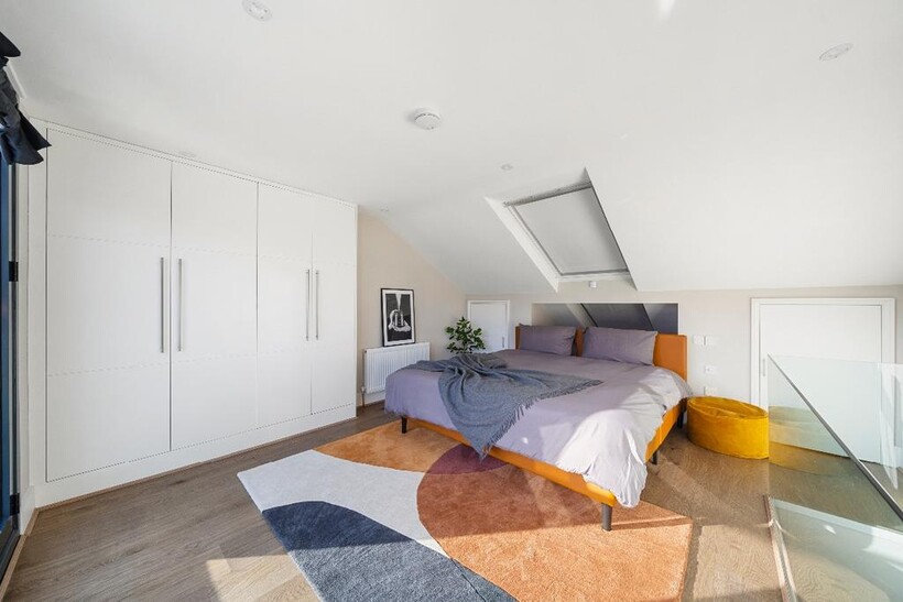 The generous loft space is furnished as the fourth bedroom with a UK Super King Bed, wardrobes, Velux windows and a large french window offering south garden aspect.