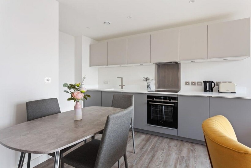 The open plan living space features a modern, fully equipped kitchen which has everything you need to cook your own meals at home. The comfortable furnishings provide the perfect space to sit down, relax and take in the beautiful views across the city. The central location means you are near plenty of cafes, restaurants and bars if you prefer to pop out for a morning coffee, dine out in style or enjoy a cosy takeaway. The living area also includes a large comfortabe sofa and 4K SMART TV. There is high speed broadband throughout the apartment, perfect for streaming TV (e.g Netflix), and all your browsing, social media and emailing needs