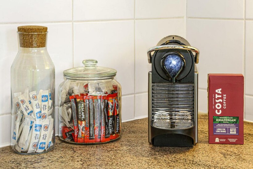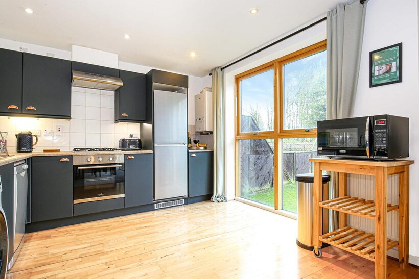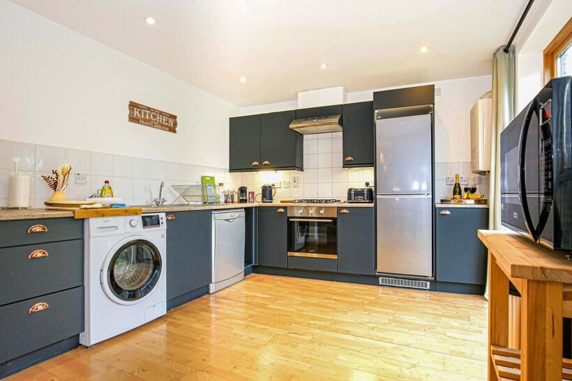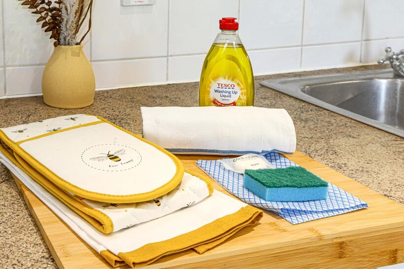 Fully equipped kitchen with fridge freezer, dishwasher, oven, stove, microwave, kettle, toaster, cookware, tableware, and utensils all provided