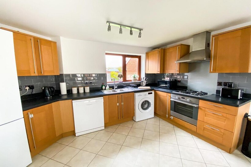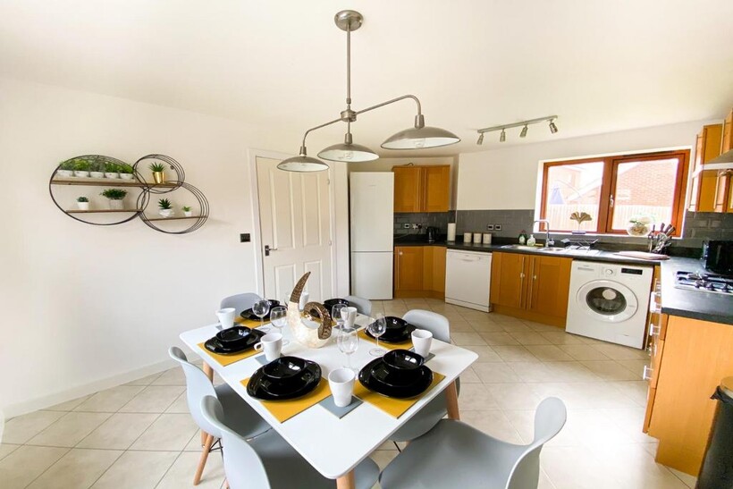 Fully equipped kitchen with fridge freezer, oven, stove, microwave, dishwasher, kettle, toaster, cookware, tableware, and utensils all provided
