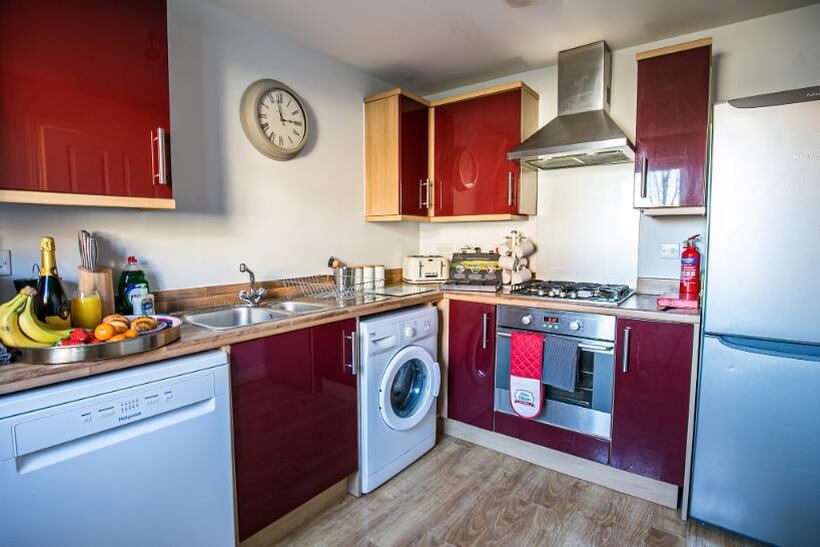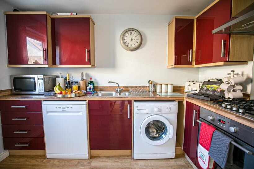 Fully equipped kitchen with fridge freezer, oven, stove, microwave, dishwasher, kettle, toaster, cookware, tableware, and utensils all provided