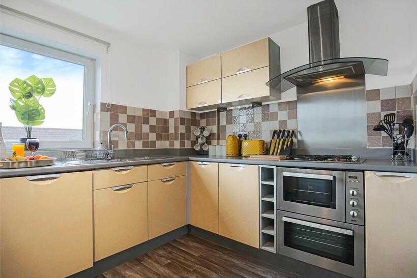 Fully equipped kitchen with fridge freezer, oven, stove, microwave, dishwasher, kettle, toaster, cookware, tableware, and utensils all provided