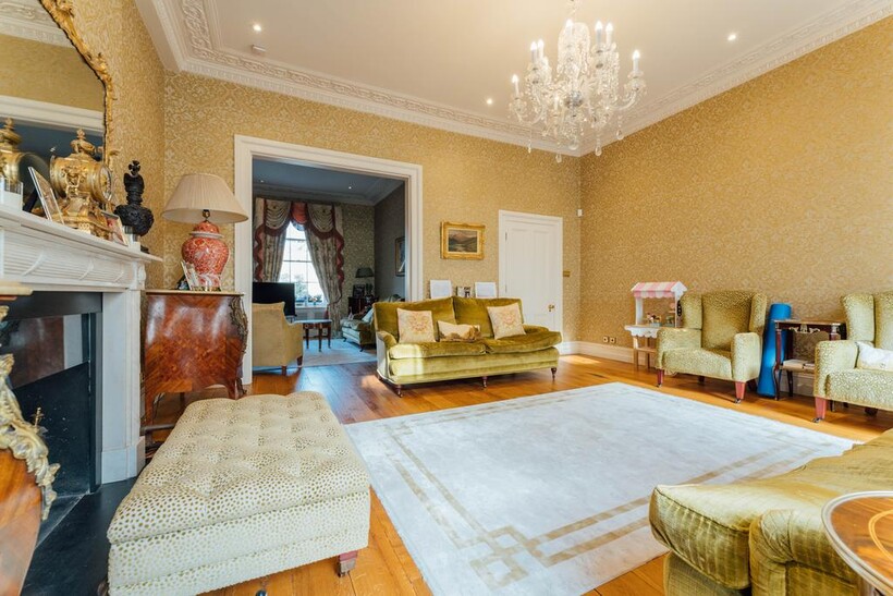 First Floor- A magnificent dual-aspect drawing room with floor-to-ceiling windows, two fireplaces, and elegant wooden flooring, offering a grand yet inviting space for relaxation and entertaining.