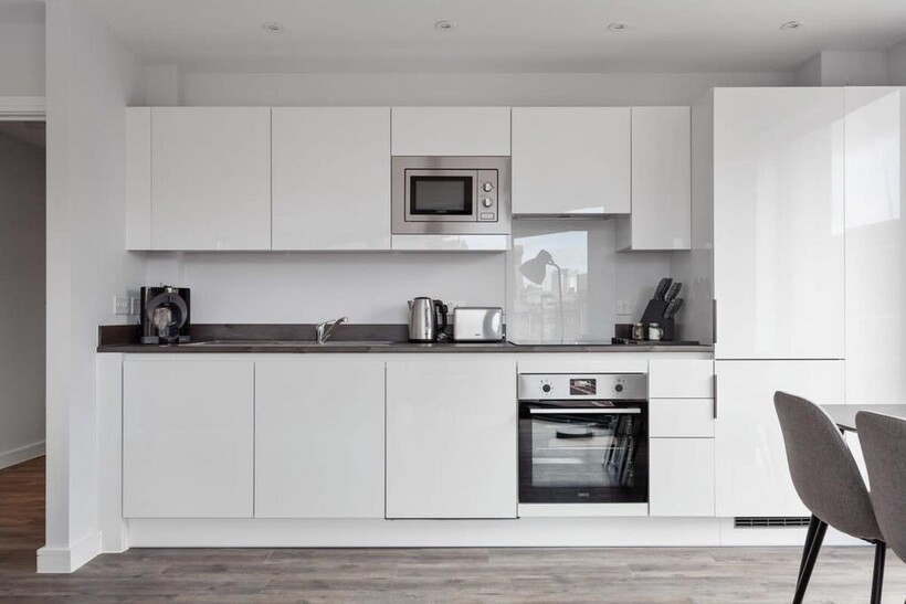 This contemporary and spacious apartment has been finished to a high standard and features comfortable furnishings and modern fixtures and fittings. The floor to ceiling windows let in plenty of natural light and create a feeling of space. The open plan living space comprises a modern fully equipped kitchen with everything you need to cook your own meals at home, a dining table and large sofa and TV. There is high speed broadband throughout the apartment. The spacious double bedrooms feature a full length window, storage space for clothes and a comfortable bed with crisp hotel linen
