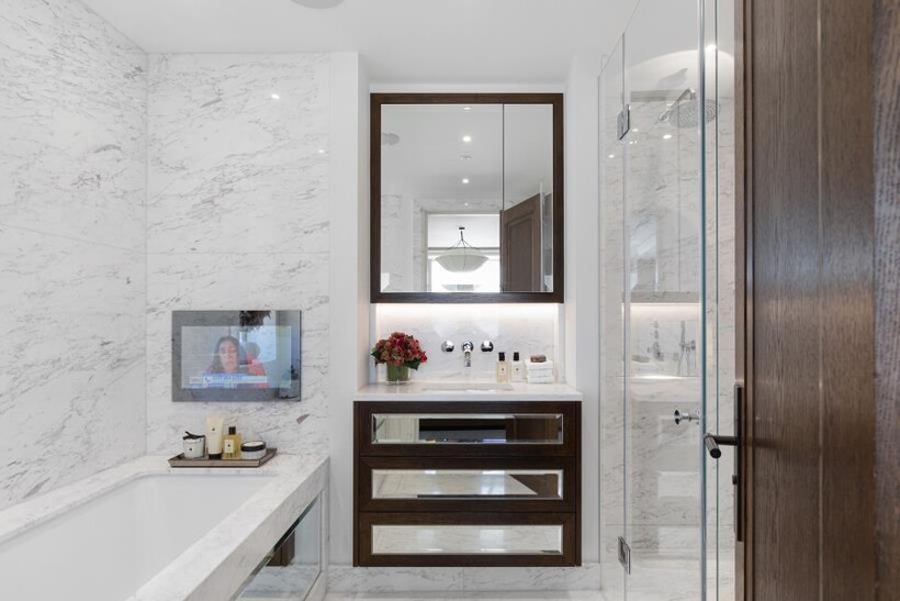 A luxurious, interior designed 1299 sq ft 3 bedroom Penthouse apartment situated on the 4th and 5th floors (with lift) of a white Stucco-fronted building with superb views over Hyde Park and London. The 4th floor comprises a grand hallway leading on to the three bedrooms. Each bedroom benefits from an en-suite bathroom with natural marble, mirrored cabinets, rainfall shower heads and Toto style VitrA V-care WC with automatic open/close seat lid. The open plan kitchen and living room are situated on the 5th floor and open up to a roof terrace with an outdoor bio-fuel fire pit and 55” Samsung Terrace 4K QLED Outdoor Smart TV, perfect for hosting guests and warm weather entertaining.